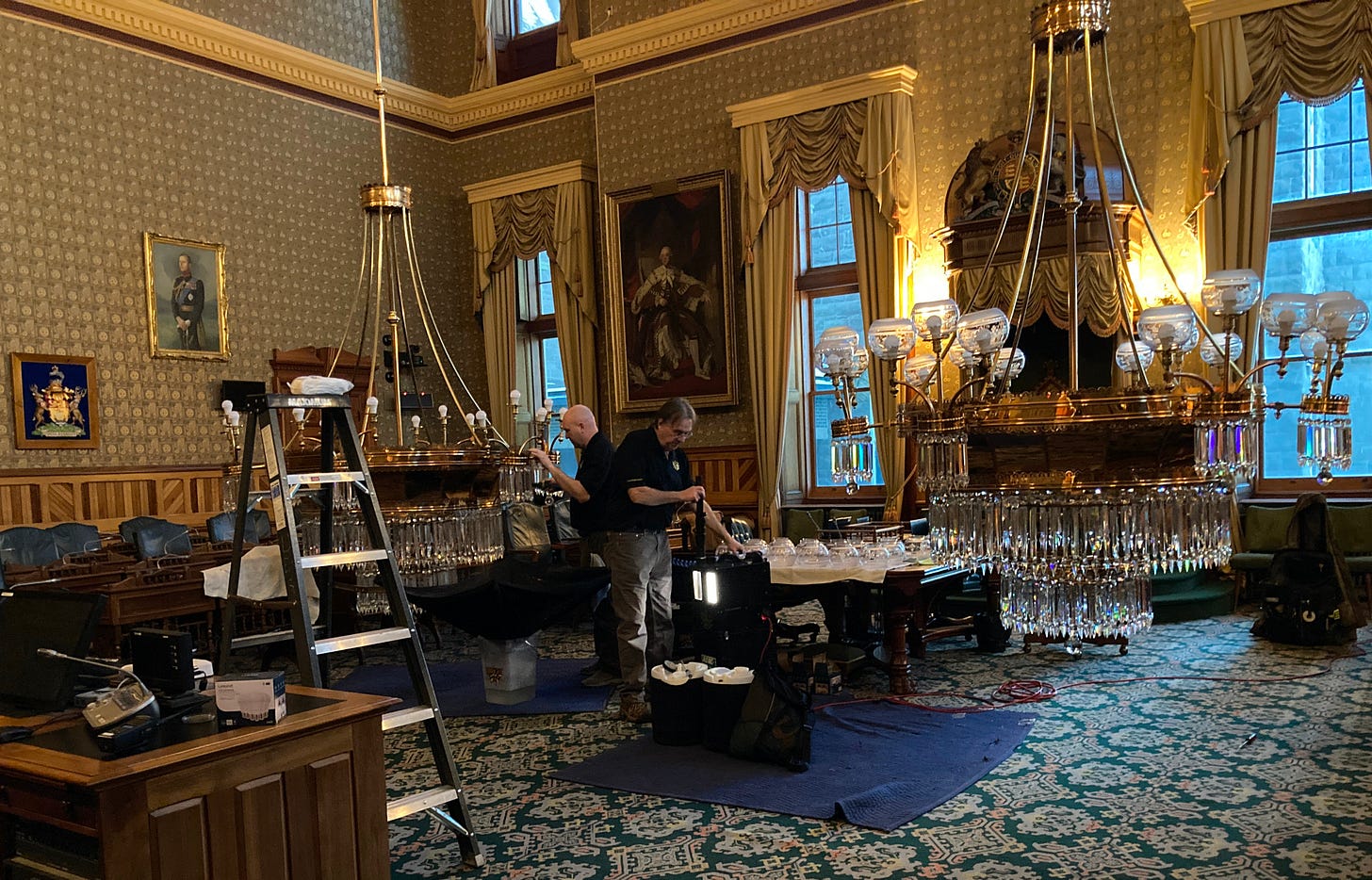 Every six to eight years, the massive chandeliers hanging from the chamber’s ceiling are carefully lowered for cleaning and maintenance. A company from New Hampshire specializing in chandeliers did the work.